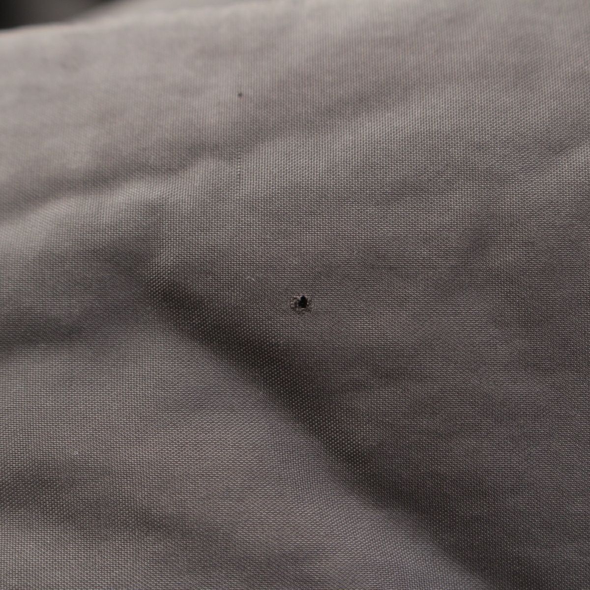 ダメージ箇所: 一番下のボタン上部に穴あき、襟に汚れ、右袖に汚れ/穴あき、右肩部分に汚れ、ボタン裏に汚れ、保管臭のようなニオイ